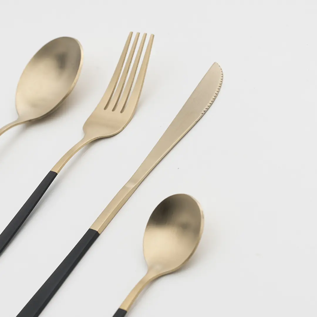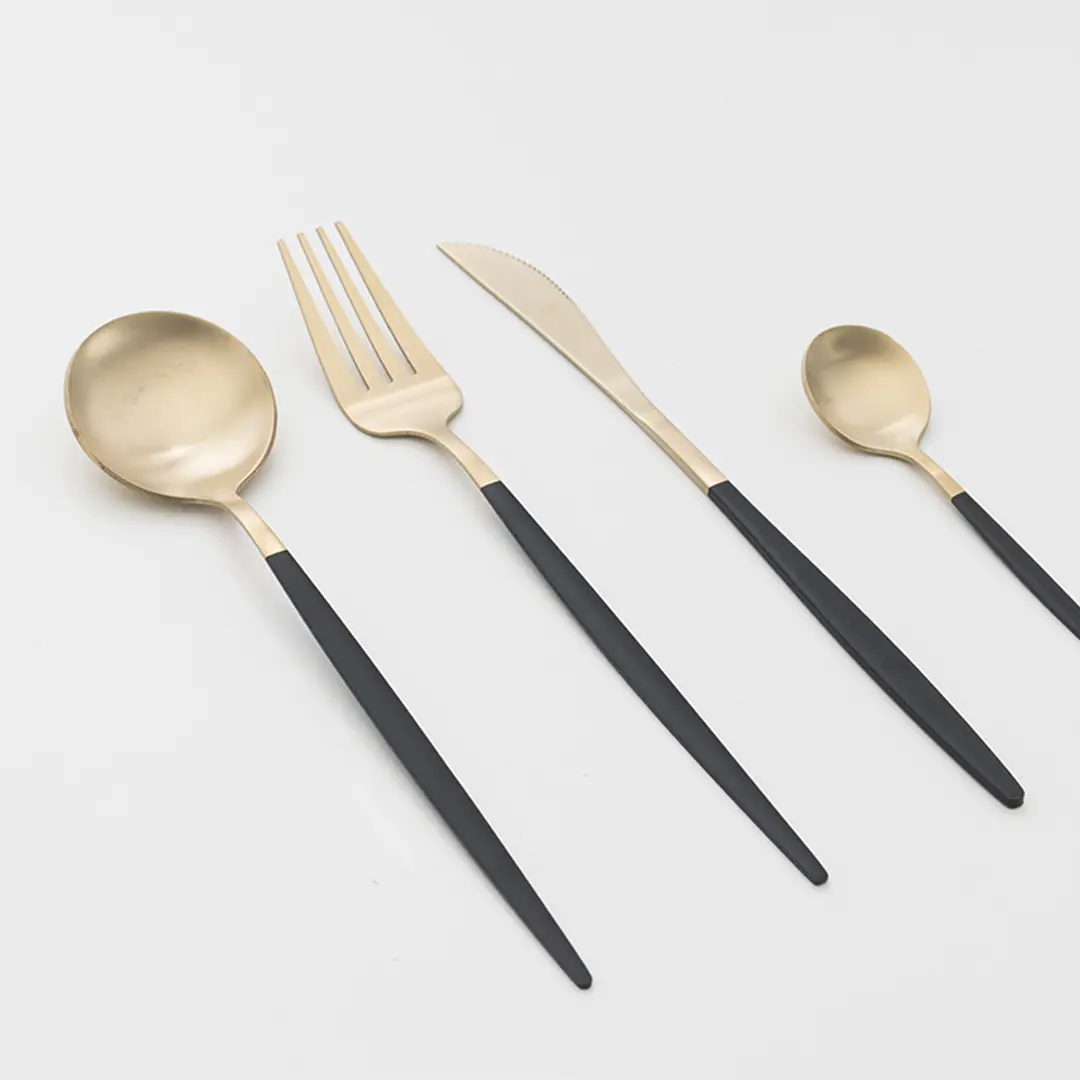 La cubertería dorada con mango negro es la elección perfecta para quienes desean añadir sofisticación y elegancia a la mesa. Este conjunto, compuesto por cuchillo, tenedor, cuchara y cucharilla, destaca por su acabado dorado mate y sus empuñaduras negras, que combinan estilo moderno con una estética refinada. Fabricada en acero inoxidable, no solo ofrece una presentación impecable, sino también una resistencia y durabilidad que garantizan su uso repetido sin perder atractivo.